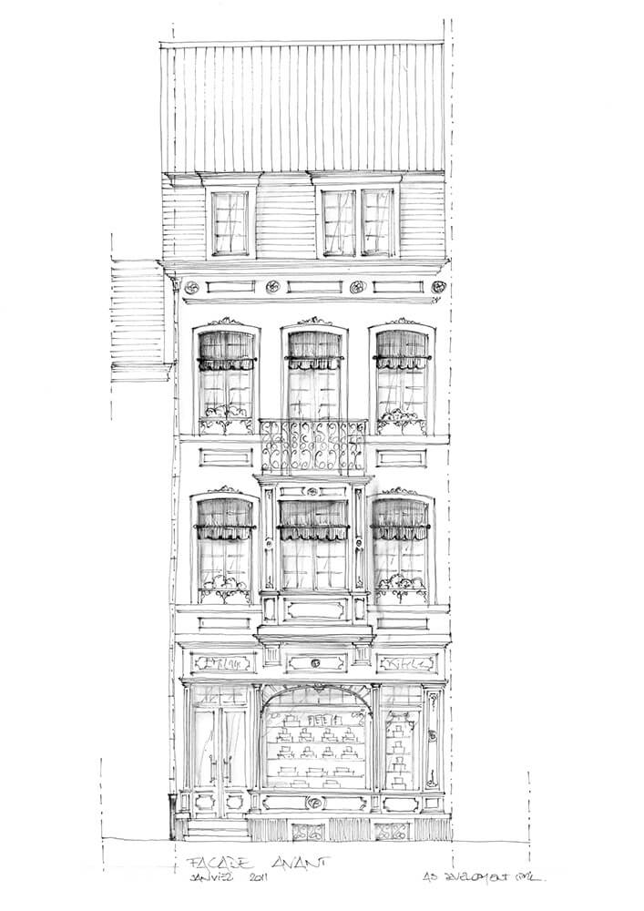 Conception et aménagement du restaurant 'La Villa Emily' dans une petite maison de commerce et d’habitation située dans le quartier des galeries d’art. Au vu des petites superficies disponibles, le concept s’est très rapidement développé autour du bar et de la cuisine ouverte sur le rez-de-chaussée et la vitrine à rue. Une salle située au premier étage reste en contact avec la cuisine via une ouverture entre les deux niveaux. Aux étages s’établissent des salons privés et une suite d’hôtel. Le défi du projet a été d’intégrer l’ensemble du programme dans un immeuble présentant une superficie au sol d'environ 60m².